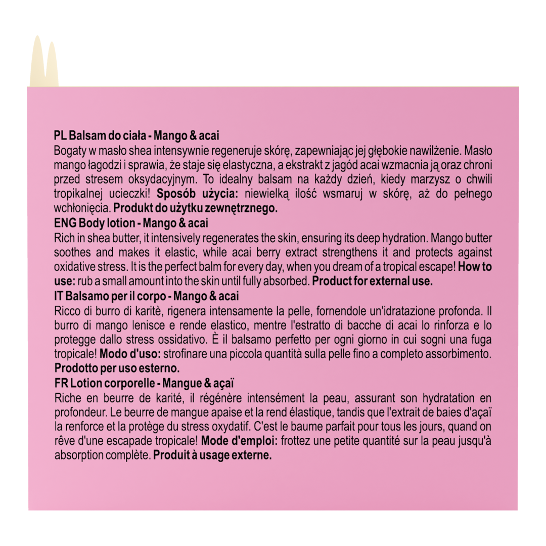 Soczyste mango i jagody acai – duet, który rozpieszcza ciało i zmysły! Balsam dogłębnie nawilża i pozostawia skórę miękką w dotyku. A ten zapach? Owocowy koktajl, który przenosi prosto na słoneczną plażę! Poczuj tropikalny vibe na własnej skórze!